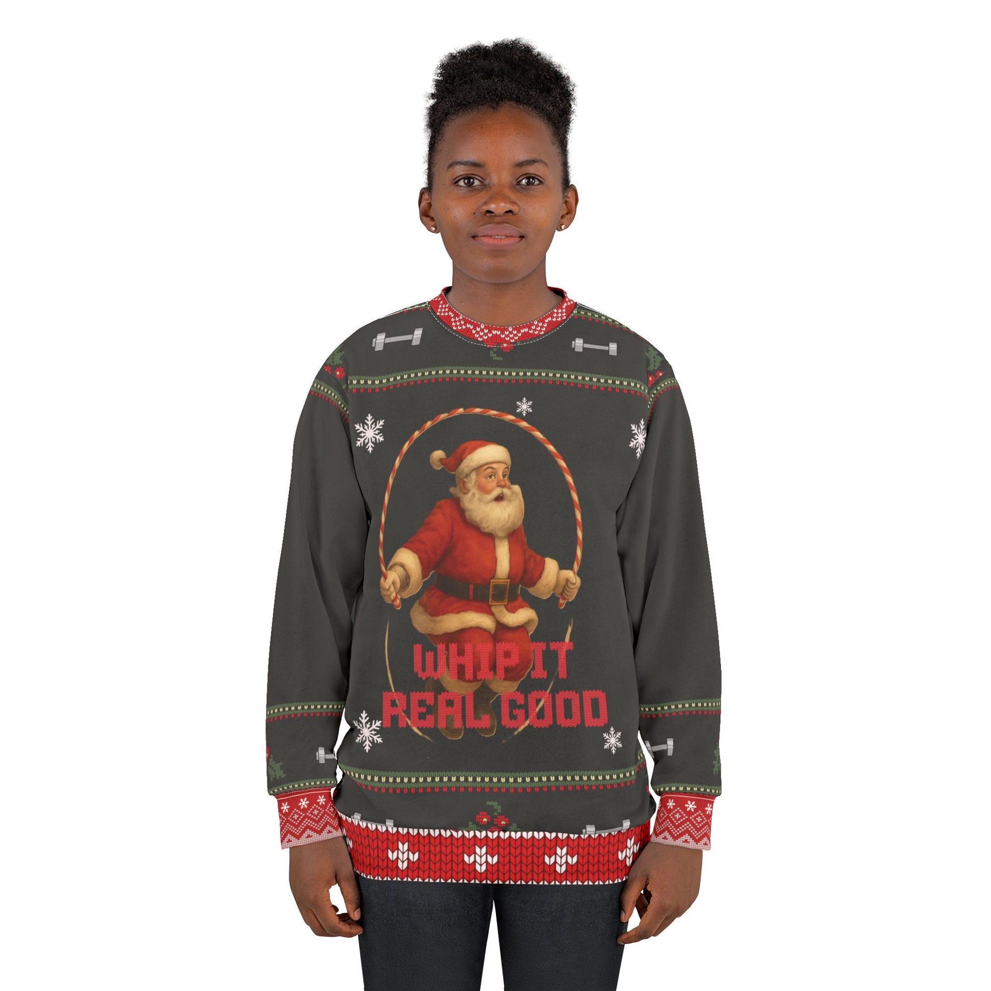 Whip It Real Good Funny CrossFit Ugly Christmas Sweater – Santa Jump Rope Holiday Sweatshirt, Fitness Xmas Gift for Gym Lovers
