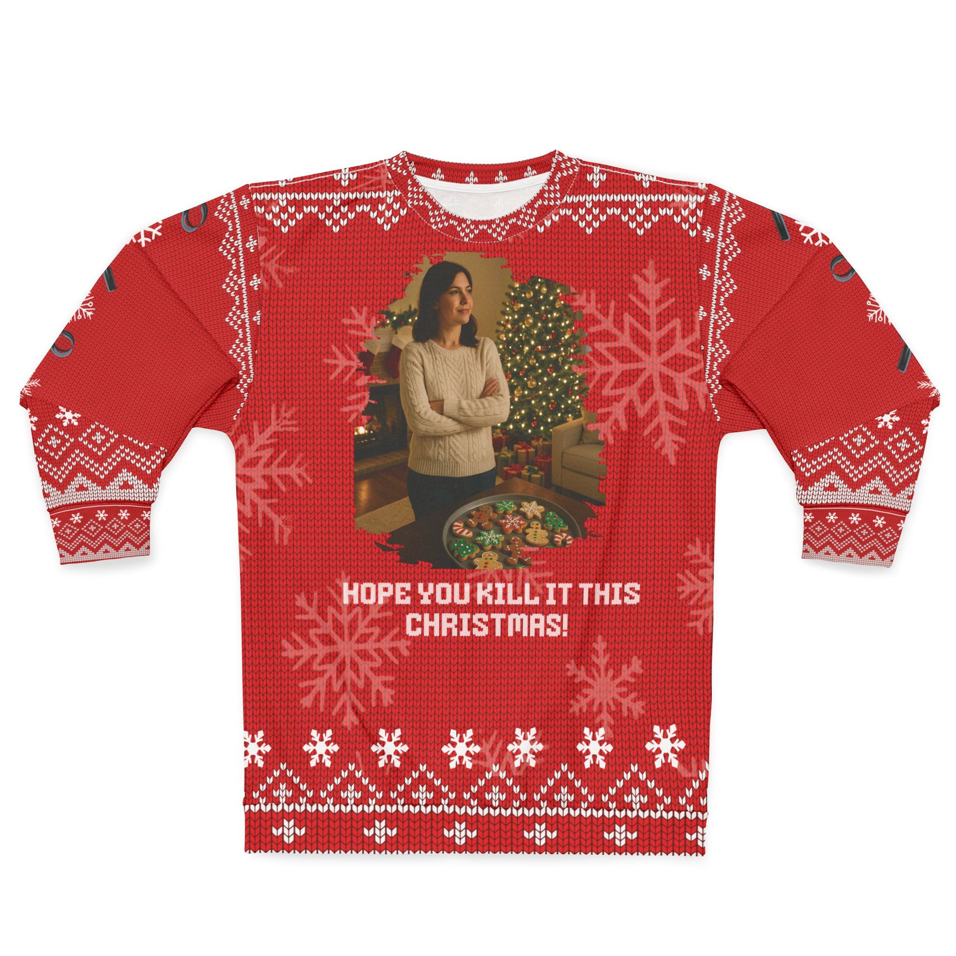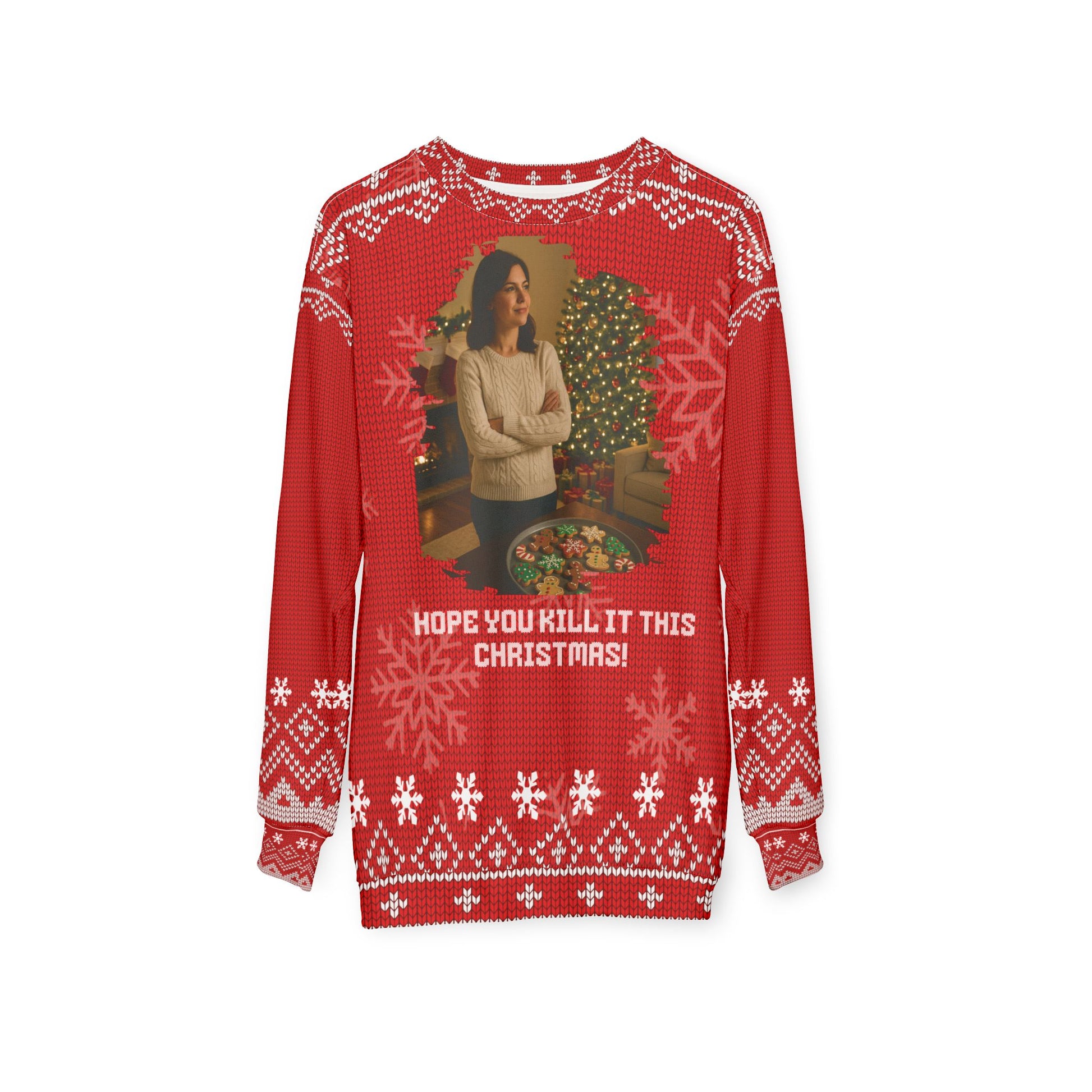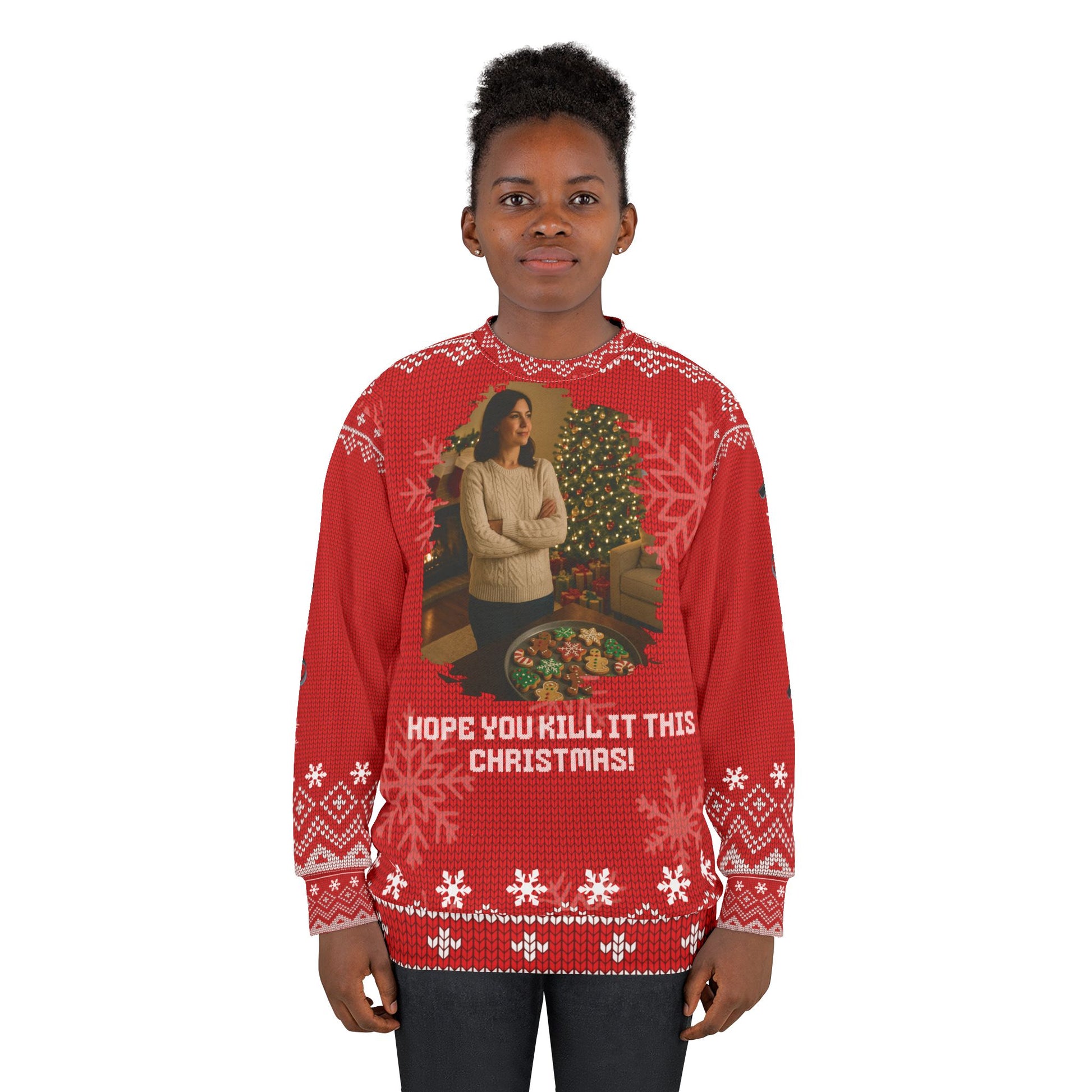 This cozy “Hope You Kill It This Christmas!” sweater features a festive scene: a woman standing proudly over a tray of decorated holiday treats in a warmly lit Christmas setting. Paired with bold red knit-style patterns and playful snowflakes, this sweatshirt blends cozy holiday charm with a cheeky true-crime twist.