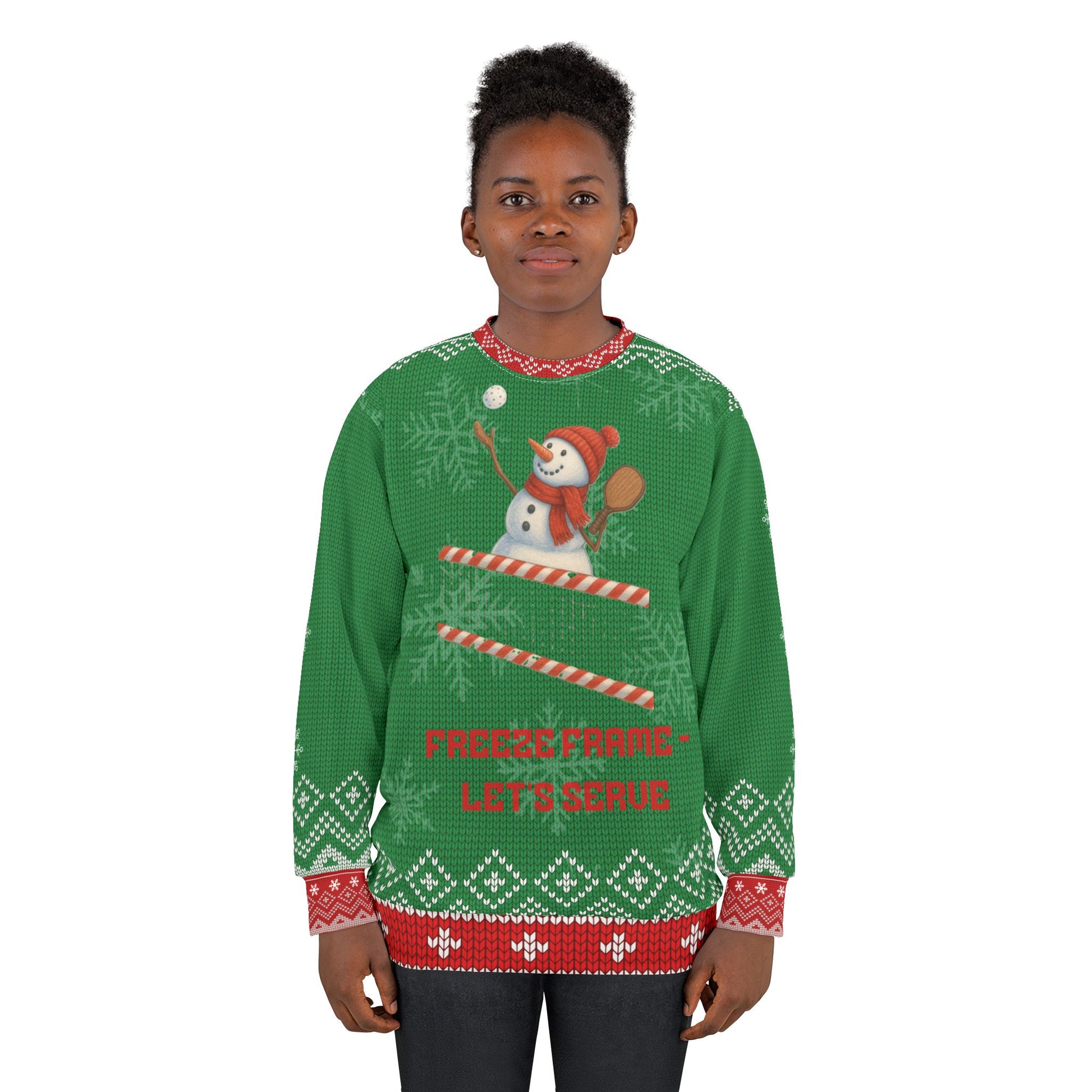 Funny Pickleball Ugly Christmas Sweater | Freeze Frame Snowman Let’s Serve Sweatshirt | Holiday Gift for Pickleball Players