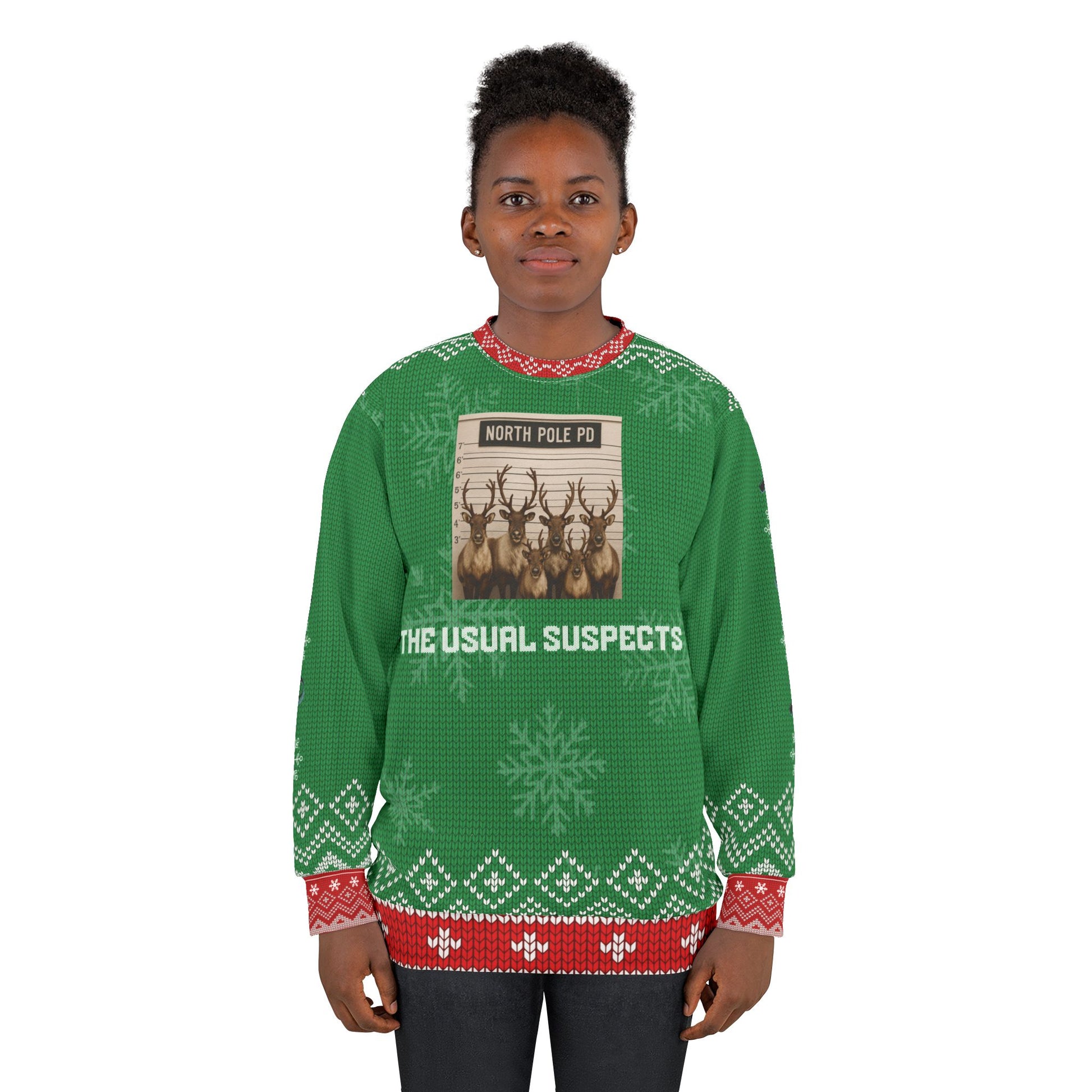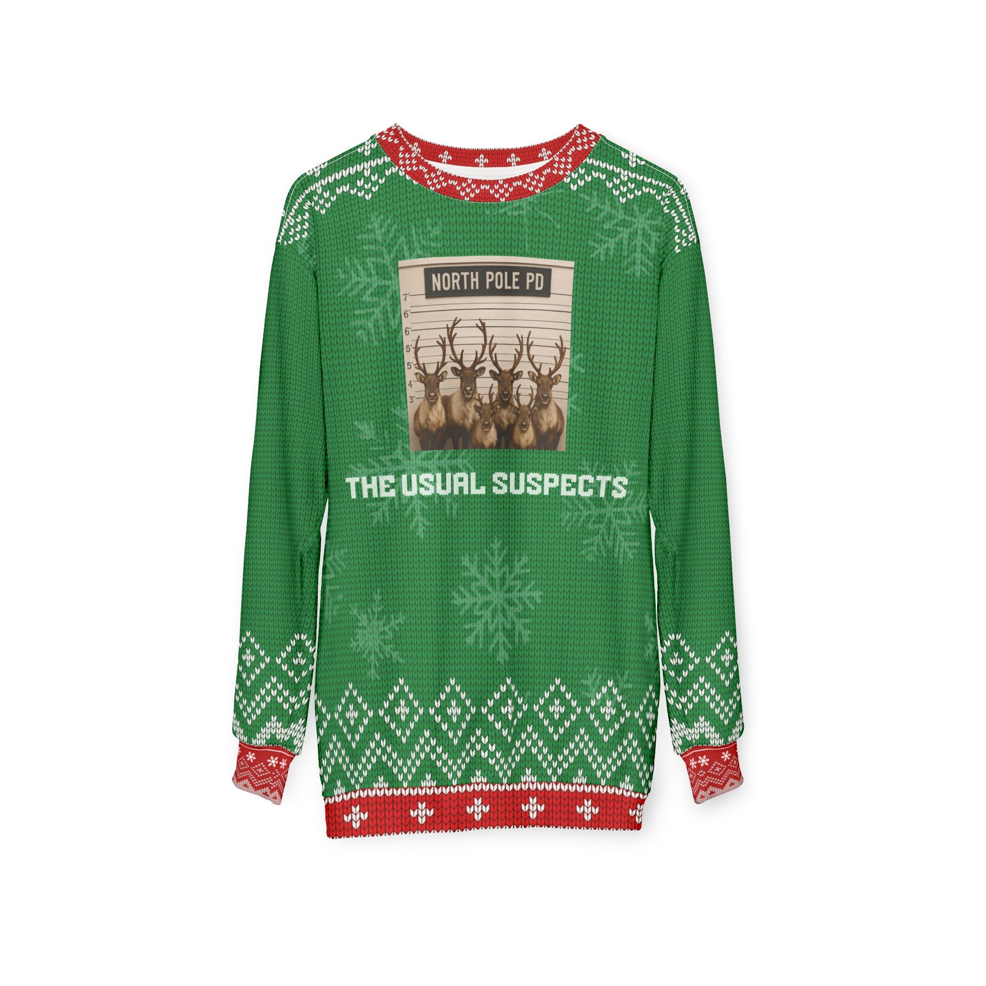 Get ready to crack up the crowd at your next holiday party with this “North Pole PD: The Usual Suspects” Ugly Christmas Sweater!