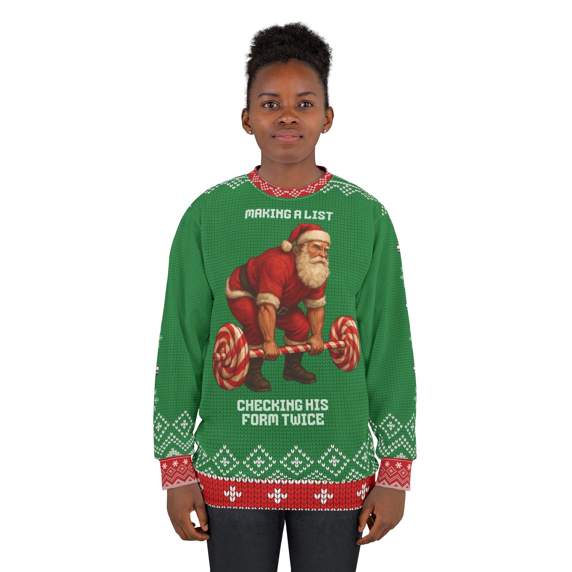 Making a List Checking His Form Twice Funny CrossFit Ugly Christmas Sweater – Gym Lover Holiday Sweatshirt, Santa Weightlifting Xmas Gift