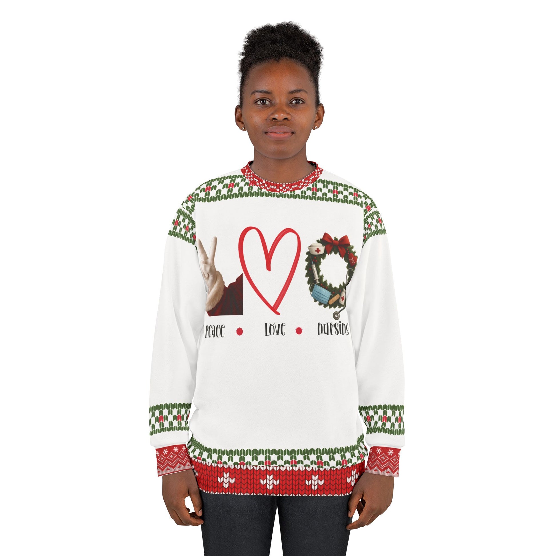 Peace Love Nursing Christmas Sweater | Nurse Holiday Ugly Xmas Sweater | RN LPN CNA Medical Sweatshirt | Nurse Christmas Gift