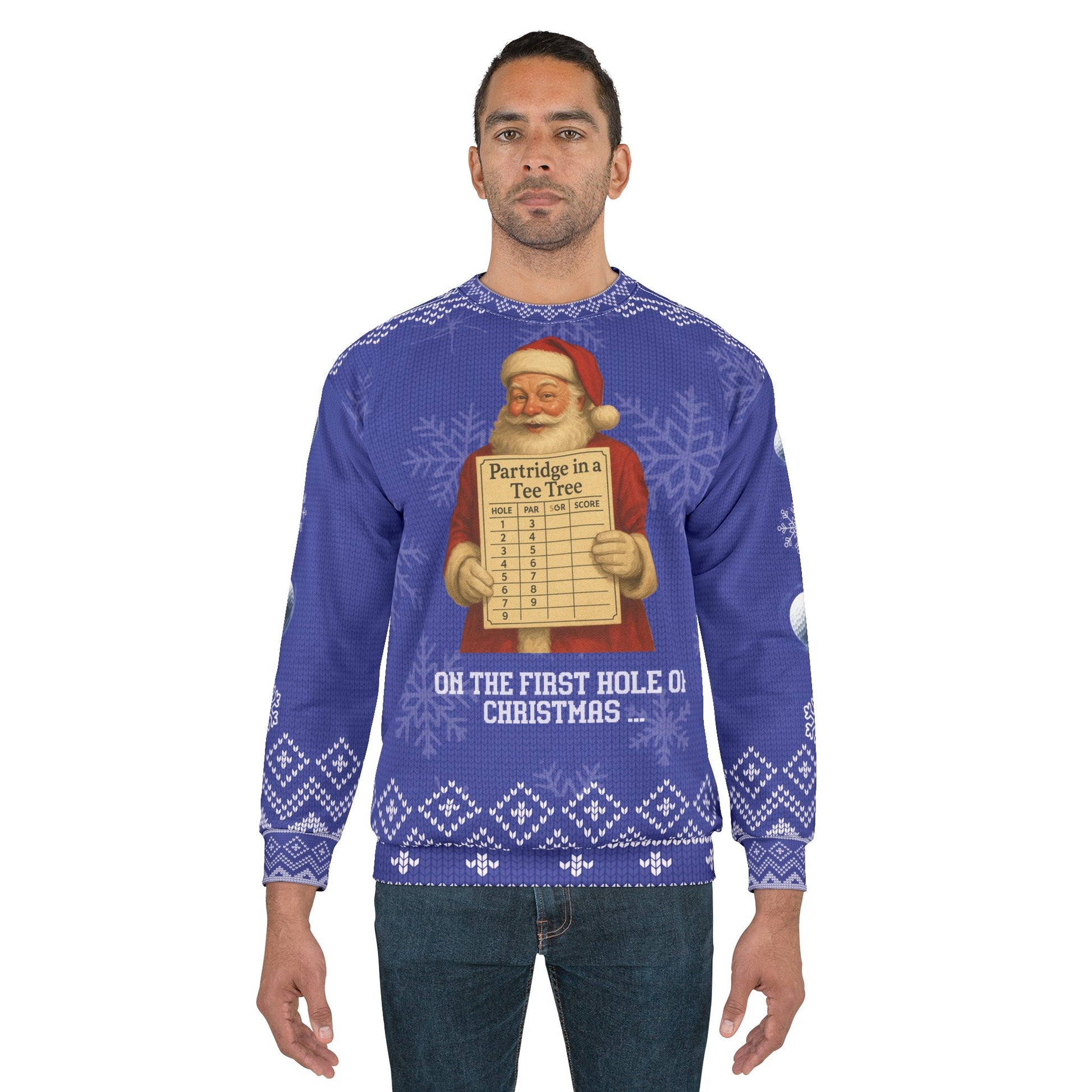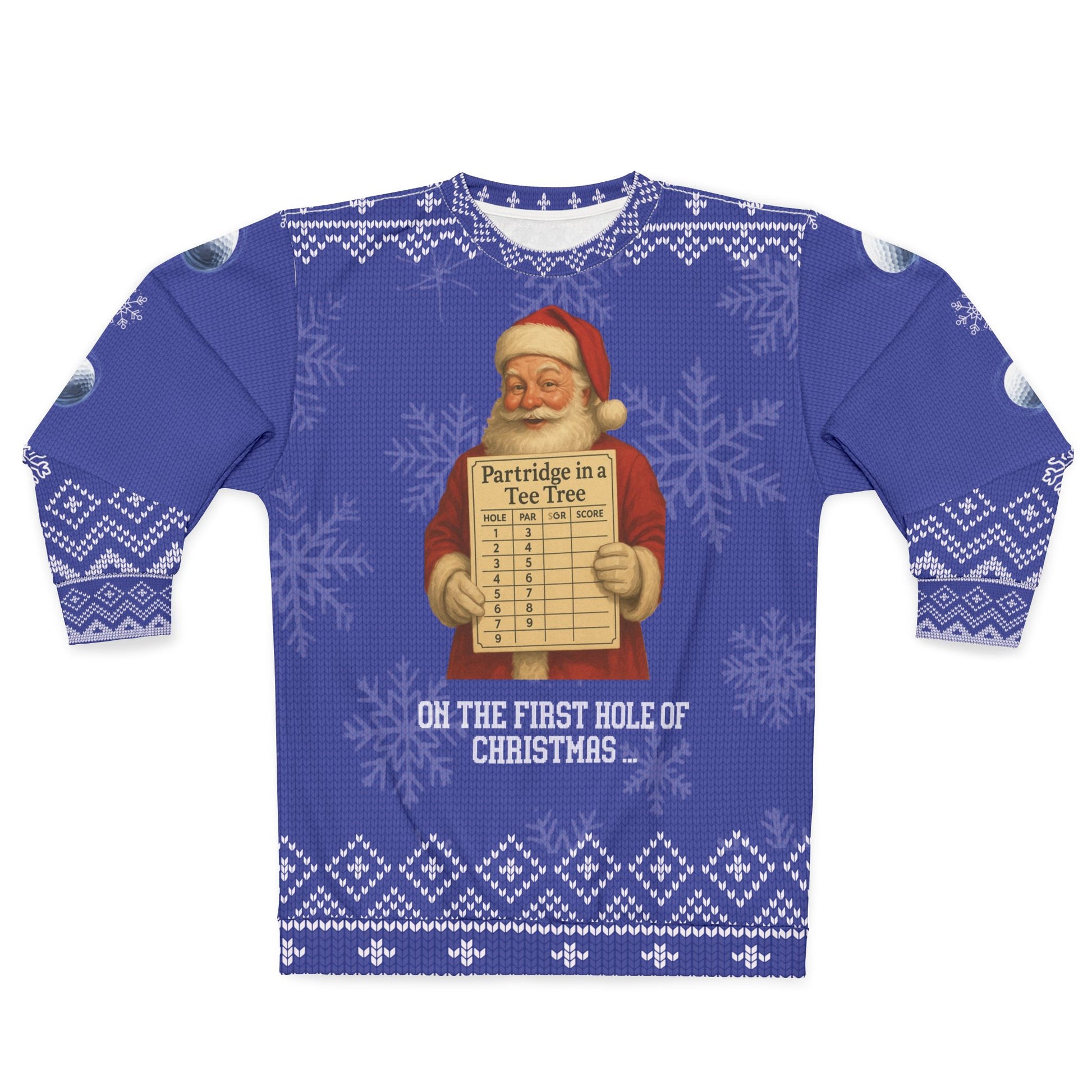 Featuring a bold red knit-style design with snowflake patterns and a golf bag full of wrapped presents, this sweater celebrates Santa’s true secret weapon — his impressive range! Perfect for ugly sweater parties, golf tournaments, or a fun day at the clubhouse, this cozy sweatshirt is sure to score laughs from tee to green.