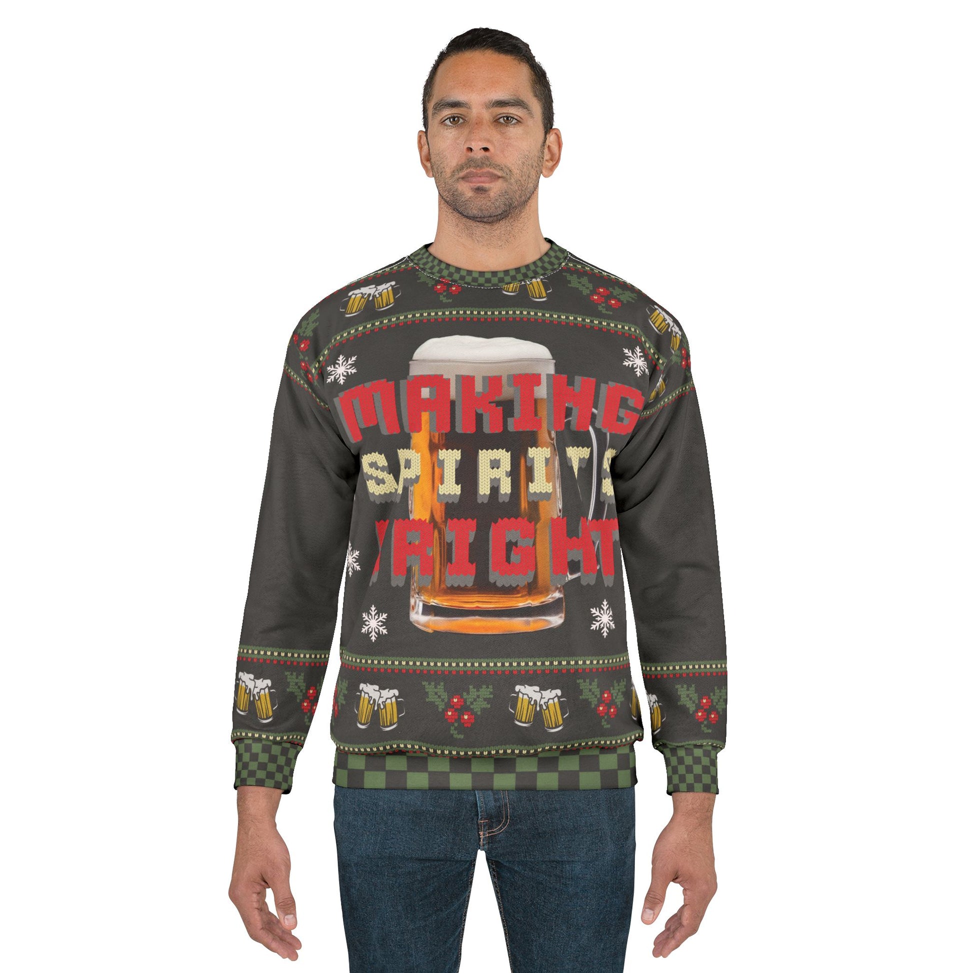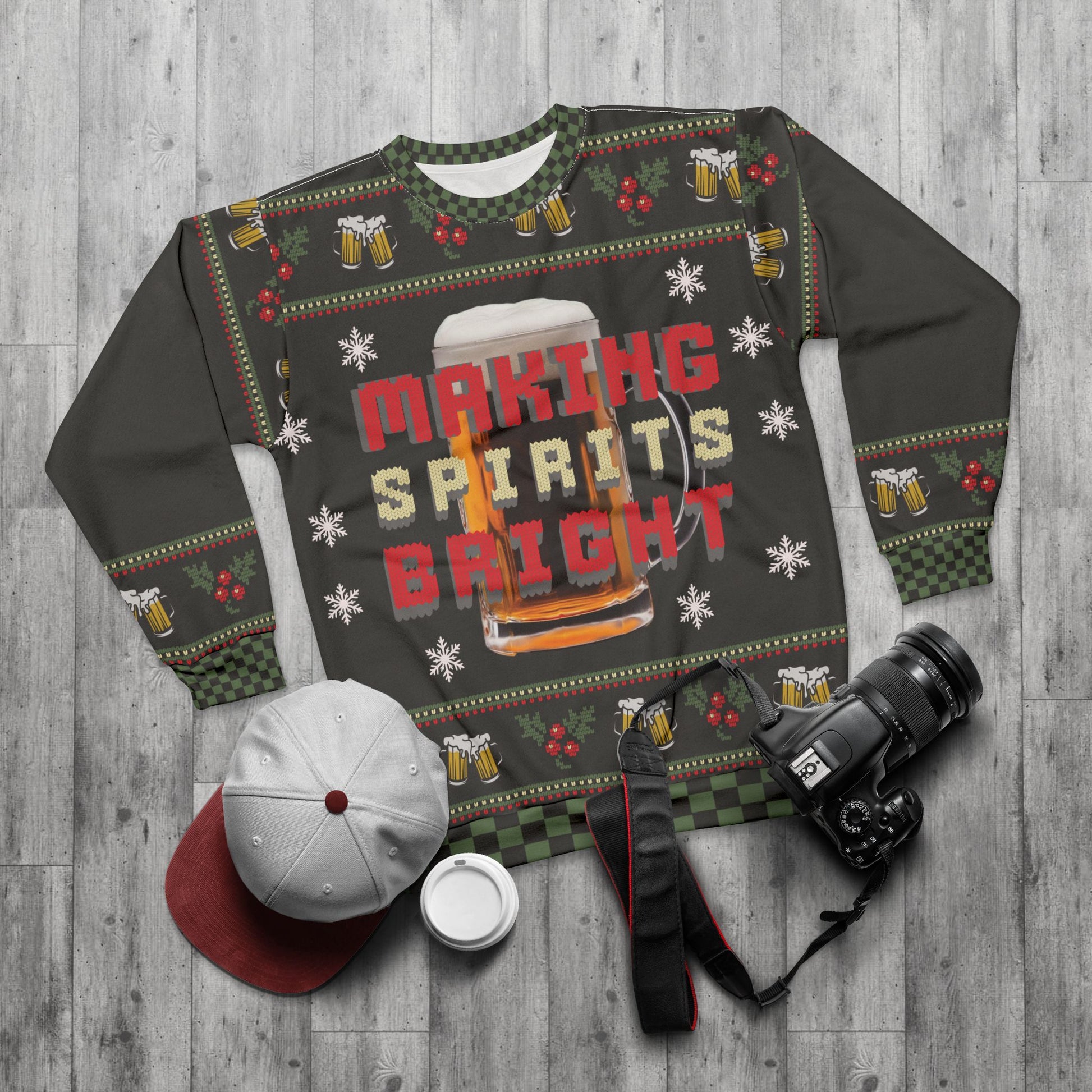 Cozy unisex sweatshirt ' UGLY CHRISTMAS SWEATER" featuring a mug of beer surrounded by snowflakes with the tagline 'Making Spirits Bright'. Perfect for beer enthusiasts and fans of holiday cheer, this sweatshirt is ideal for Christmas celebrations and festive gatherings.